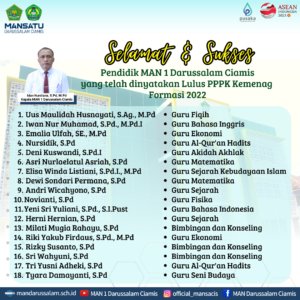 MAN 1 Darussalam Ciamis merupakan sekolah paling banyak meloloskan pendidiknya menjadi ASN PPPK sebanyak 18 orang yakni :