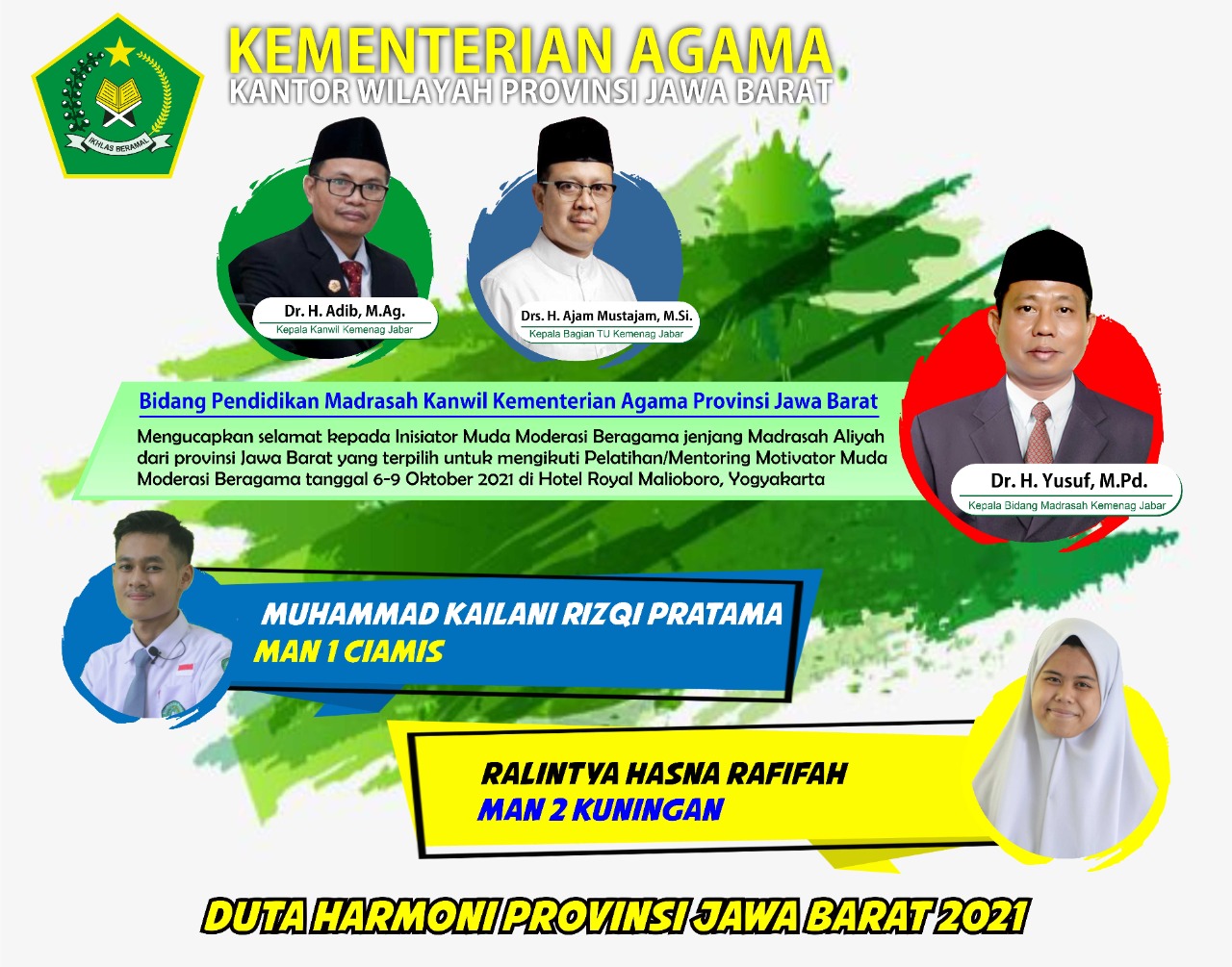 Alhamdulillah salah satu siswa MAN 1 Darussalam Ciamis berhasil menjadi Duta Moderasi Beragama tingkat Jawa Barat yang selanjutnya akan mengikuti pembinaan secara nasional di DI Yogyakarta dan menjadi pelopor moderasi beragama di lingkungan sekolah, kabupaten dan jawa barat.