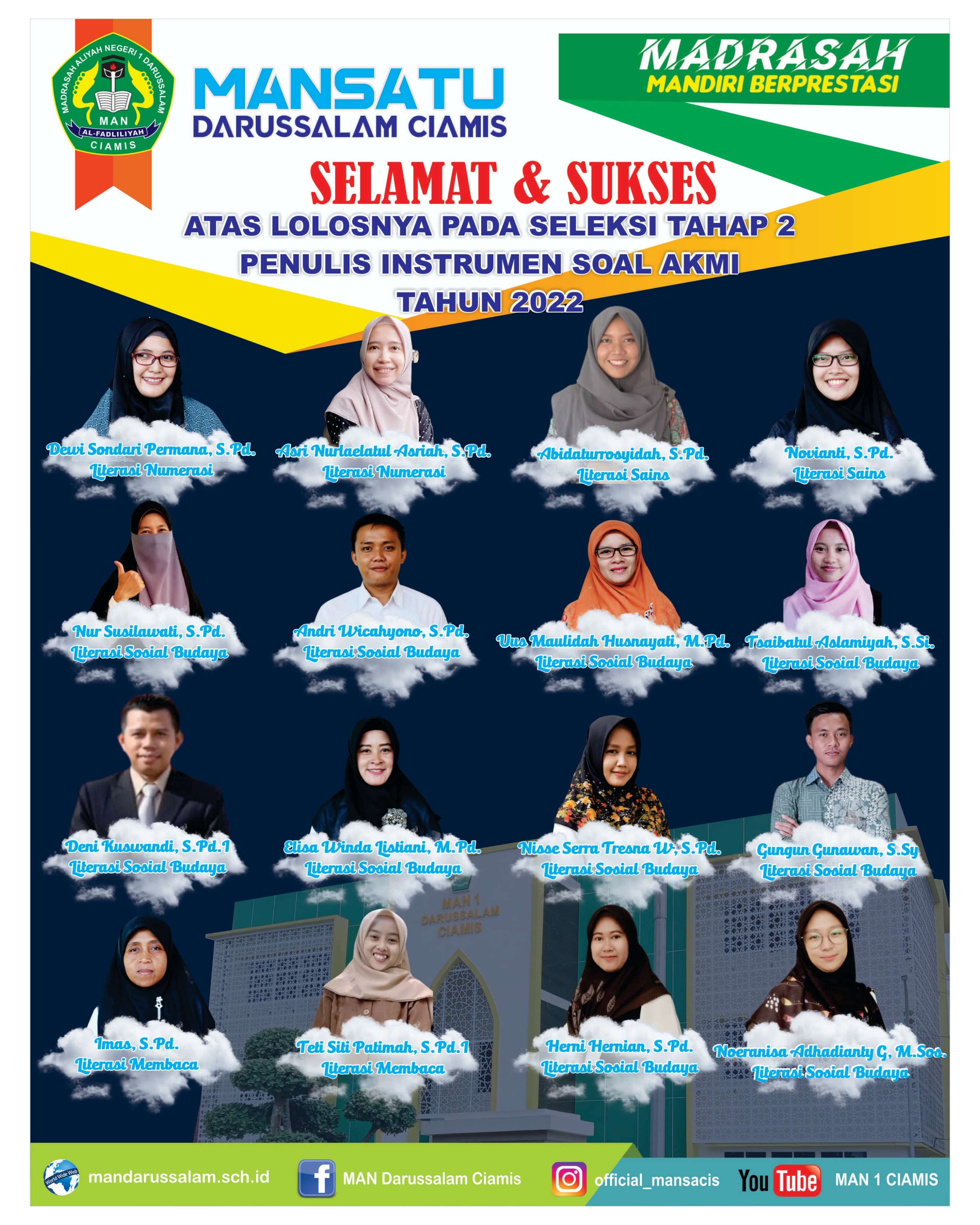 Selamat dan Sukses bagi 16 tenaga Pendidik MAN 1 Darussalam Ciamis berhasil LoloaTahap 2 Penulisan Instrumen Soal AKMI Tahun 2022