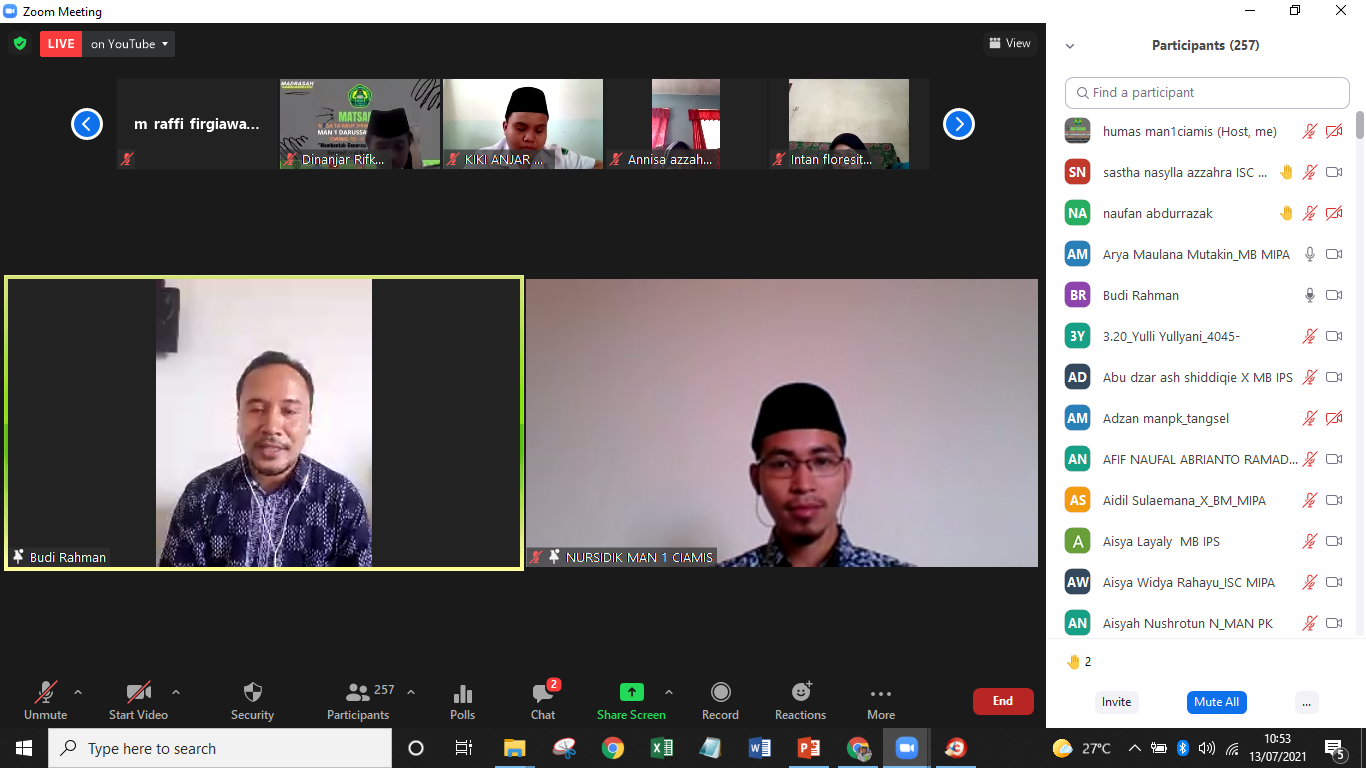 Pelaksanaan MATSAMA MAN 1 Ciamis dilaksanakan secara virtual dengan menggunakan media zoom conference dan Live Youtube pada tanggal 12 – 13 Juli 2021, dan alhamdulilah 95% siswa baru bisa mengikuyi dengan baik.