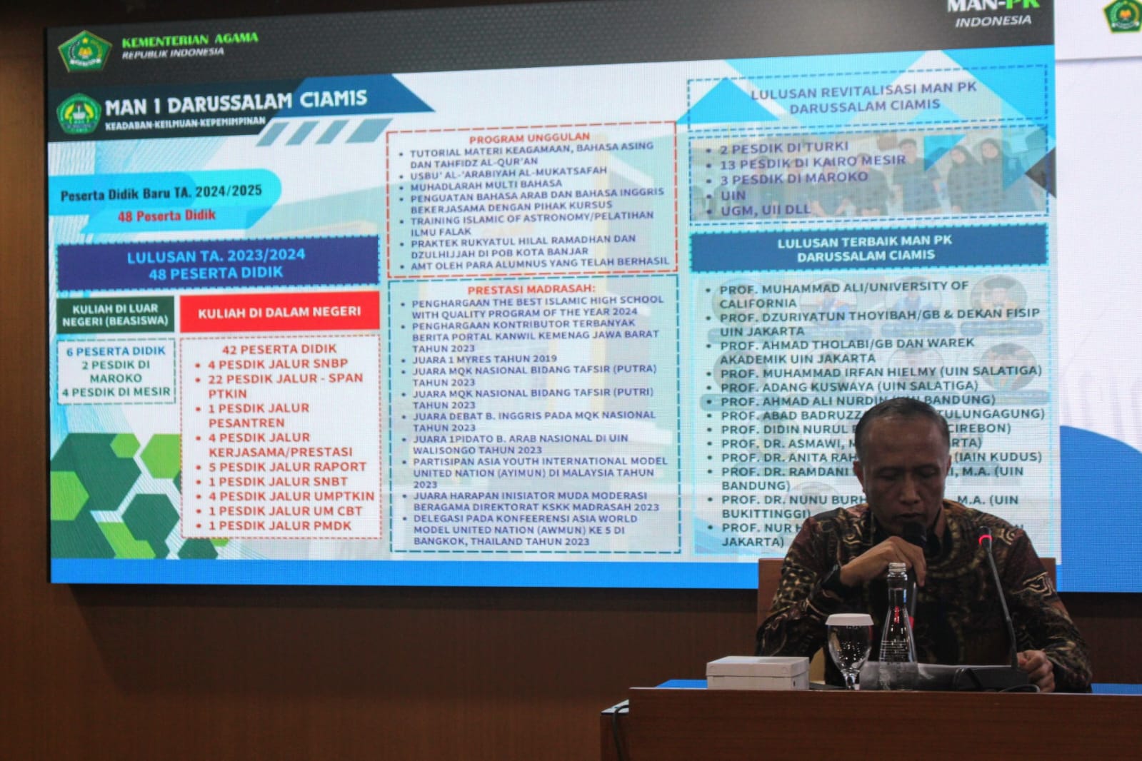 Kepala MAN 1 Darussalam Ciamis Idan Nurdiana, S.Pd., M.Pd juga berkesempatan memberikan persentasi singkat mengenai profil dari 11 MAN PK tersebut, selain itu dalam sambuatanya Pa Idan mengaku sangat antusias dan bersyukur atas terjalinya kerjasama ini, “alhamdulilah puji syukur telah terlaksana perjanjian MoU dengan UIN Jakarta salah satu PTKIN terbaik dan banya sekali khsusnya dari MAN 1 Ciamis yang memilih berkuliah di UIN Jakarta” tuturnya Pa Idan.