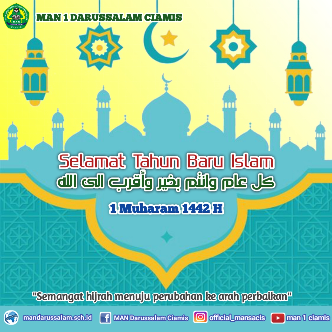 Segenap keluarga besar MAN 1 Darussalam Ciamis mengucapkan Selamat Tahun Baru Islam 1 Muharram 1442 H. Semoga kita semua dapat berhijrah ke arah perbaikan dan menjadi insan rabbani