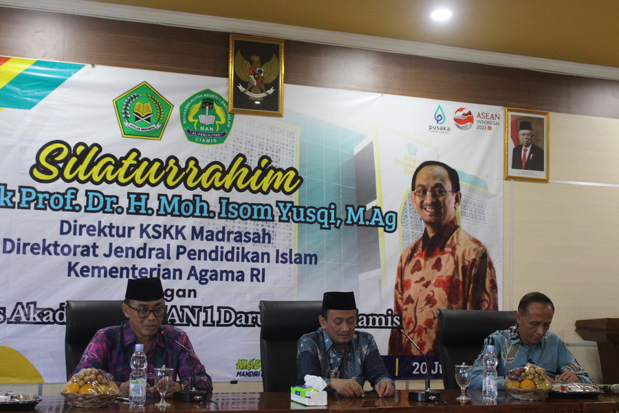 MAN 1 Darussalam (Humas)- Memasuki Tahun Ajaran Baru 2023/2024 Sivitas Akademika MAN 1 Darussalam Ciamis terus melakukan segala persiapan dan penyegaran motivasi berupa pembinaan dengan mengundang Direktur Direktorat Kurikulum, Sarana, Kelembagaan dan Kesiswaan (KSKK) Madrasah Kemenag Republik Indonesia Prof. Dr. H. Moh.Isom Yusqi, M.Ag pada hari Kamis,20 Juli 2023.